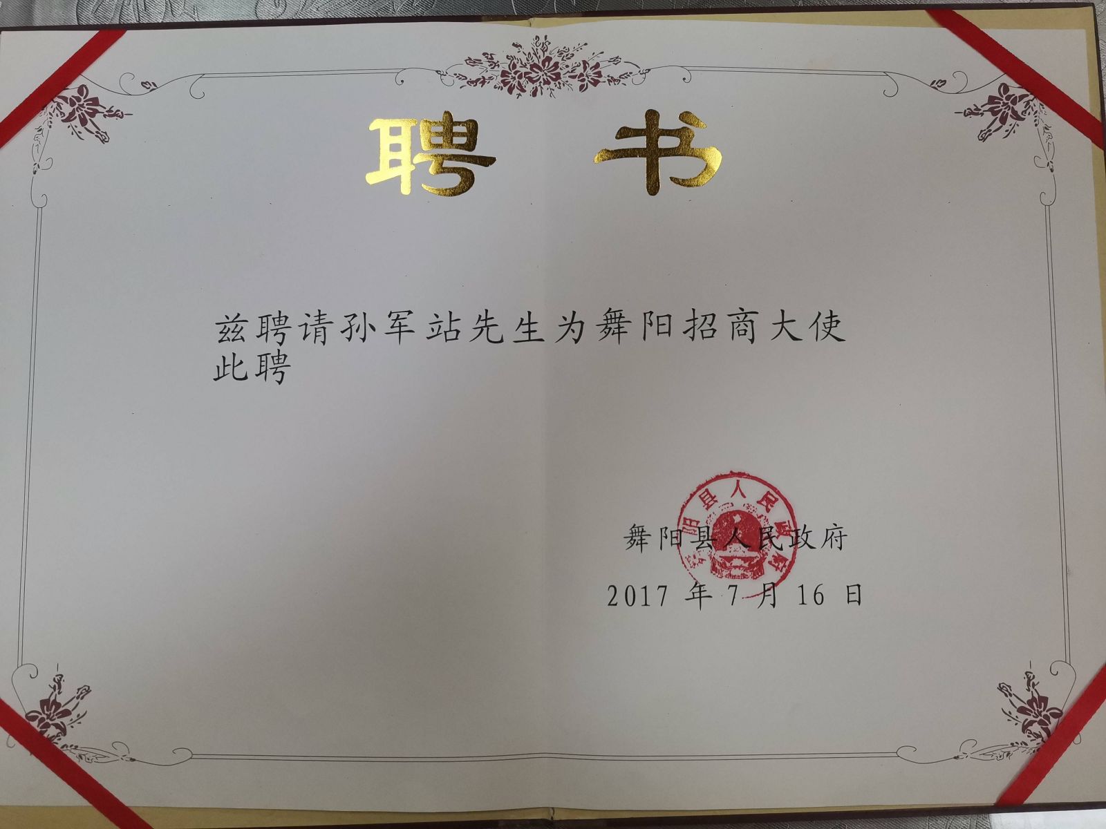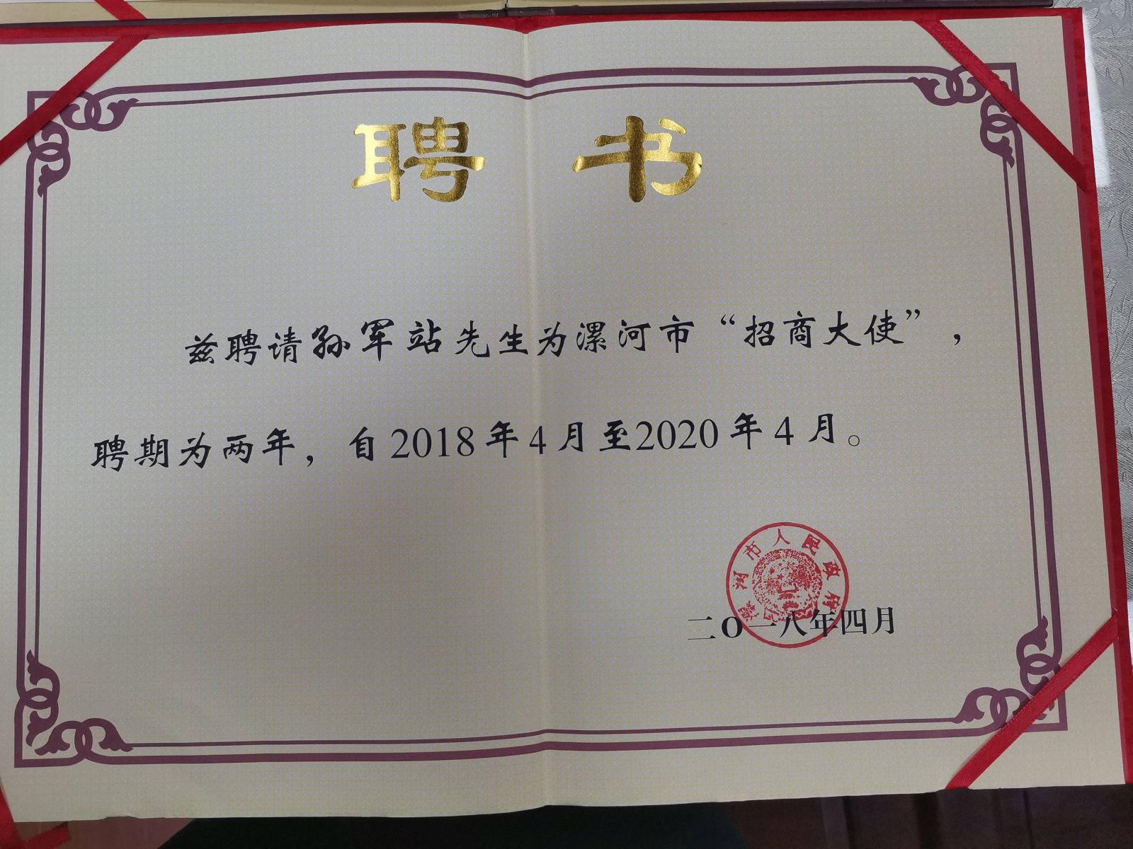 2017年,在老家河南舞陽的化工園區(qū)需要新鮮血液注入,同時(shí)長三角地區(qū)化工企業(yè)需要轉(zhuǎn)型升級(jí)、搬遷成難題時(shí),孫軍站先生立刻扛起了為省級(jí)貧困縣舞陽縣招商引資的大梁。2017年7月,是豫東公司成立15周年年慶,也是豫博公司投產(chǎn)成功的大日子,利用他在業(yè)內(nèi)廣泛的人脈關(guān)系,孫軍站邀請(qǐng)了160多家企業(yè)260多名客商在舞陽舉行招商活動(dòng),成功簽署7個(gè)化工項(xiàng)目,為此,被舞陽縣政府授予“舞陽縣招商大使”的稱號(hào)。為了不辱使命,他又決定再購買60多畝地,成立豫博工業(yè)園區(qū),三年來,幫助舞陽縣醫(yī)藥園區(qū)引進(jìn)優(yōu)質(zhì)項(xiàng)目14個(gè),投資金額30億元,帶來就業(yè)崗位1060個(gè)。贈(zèng)人玫瑰,手留余香。正因?yàn)槌錾恼猩坛尚?,孫軍站先生收到了舞陽縣5萬元的獎(jiǎng)勵(lì)金,還被授予"舞陽縣招商大使",“漯河市招商大使”的稱號(hào),豫東國貿(mào)有限公司也被授予"舞陽縣駐長三角地區(qū)招商基地"。